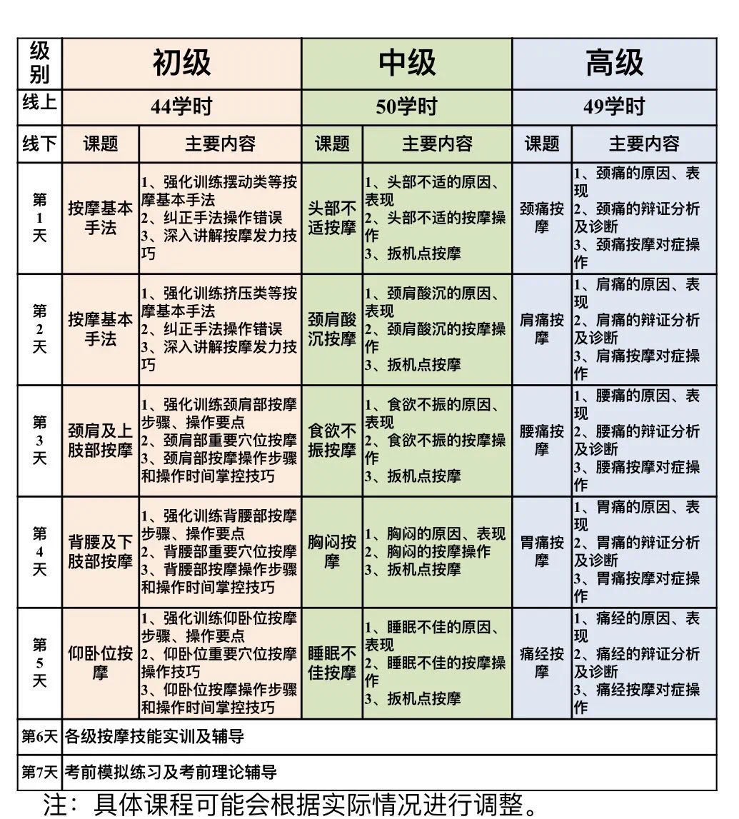 3.以下是初、中、高級保健按摩師職業技能等級培訓具體課程內容: