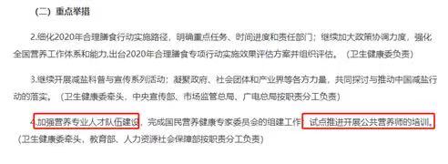 國務院發布的《健康中國行動(2019—2030年)》明確提出,到2022年要求每萬人中有一名公共營養師(營養指導員)。