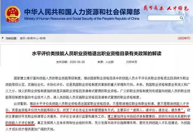 根據政府“放管服”和對技能人員評價制度進行深度改革的要求,2020年人社部發布《關于做好水平評價類技能人員職業資格退出目錄有關工作的通知》,公布將于2020年12月31日前將水平評價類技能人員職業資格分批有序退出目錄。然而,人社部同時一再強調,推動水平評價類技能人員職業資格退出國家職業資格目錄,不是取消相應職業和職業標準,更不是取消技能人才評價。只是由資格評價改為技能等級認定,改變了評價發證主體和管理服務方式,實行“誰用人、誰評價、誰發證、誰負責”,真正發揮用人主體作用和社會組織作用,為技能人才成長成才提供更加廣闊的天地。