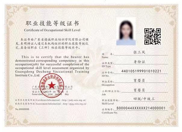 考核合格者,頒發廣東省德誠職業培訓學院有限公司簽章的“育嬰員職業技能等級證書”。該證書可以作為就業、升職、加薪等的憑證。
