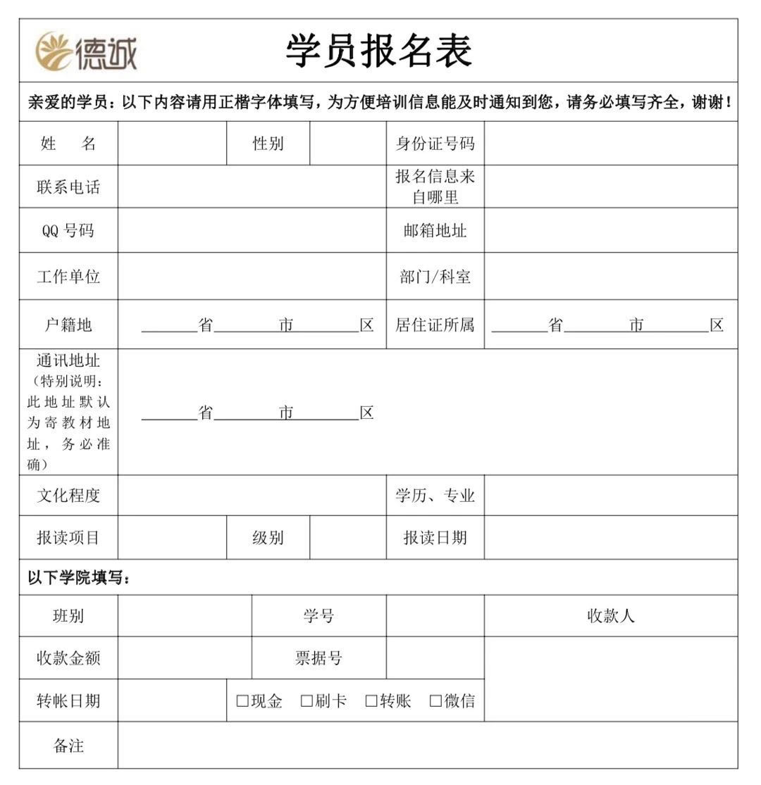 交德誠學院《學員報名表》1 份(附件1,其他資料將在考試前通知繳交)并完成繳費。咨詢電話:020-84264281。