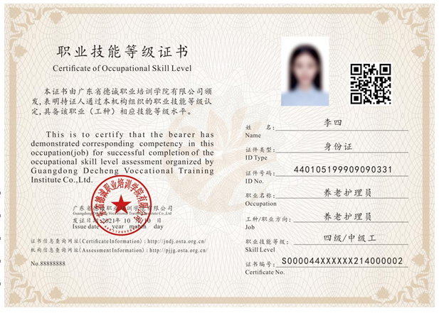 考核合格者,頒發(fā)廣東省德誠職業(yè)培訓(xùn)學(xué)院有限公司簽章的“養(yǎng)老護(hù)理員職業(yè)技能等級(jí)證書”。該證書可以作為就業(yè)、升職、加薪等的憑證。