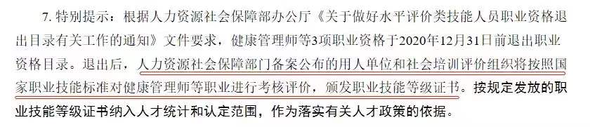 經政府人社部門備案公布的用人單位和社會培訓評價組織將按照國家職業技能標準對健康管理師等職業進行考核評價,頒發職業技能等級證書。按規定發放的職業技能等級證書納入人才統計和認定范圍,作為落實有關人才政策的依據。
