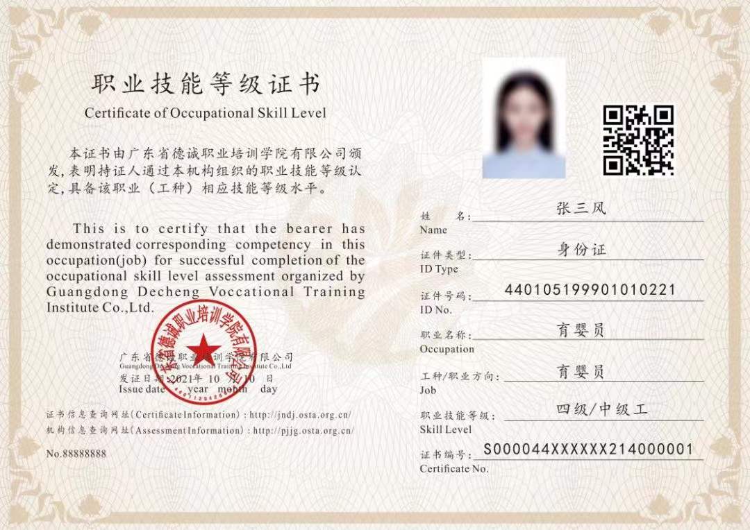 考核合格者,頒發(fā)廣東省德誠職業(yè)培訓(xùn)學(xué)院有限公司簽章的“育嬰員職業(yè)技能等級(jí)證書”。該證書可以作為就業(yè)、升職、加薪等的憑證。