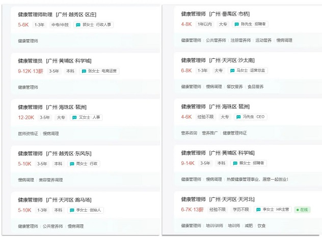 根據近幾年的市場招聘情況,市面上健康管理師月薪平均有6000元以上,部分可以達到五位數,作為稀缺人才資源,薪酬待遇與傳統職業相比更具優勢。