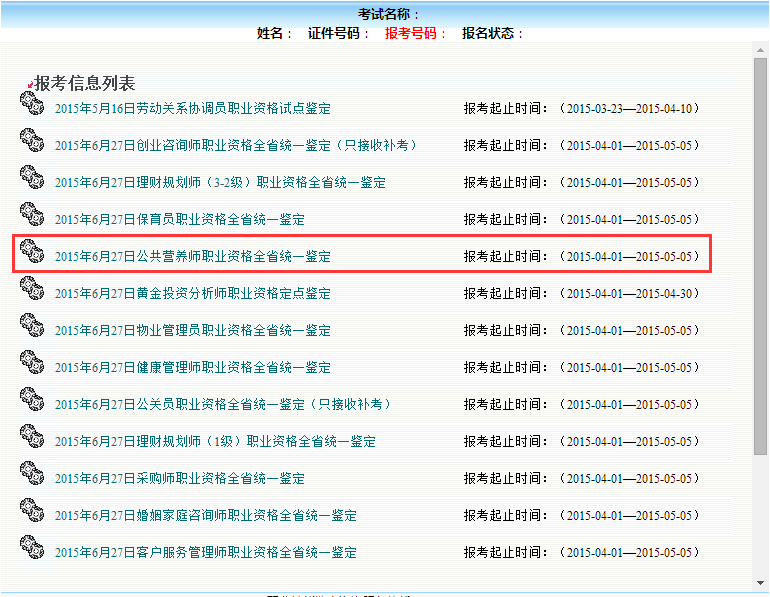 第二步:點擊2015年6月27日公共營養(yǎng)師職業(yè)資格全省統(tǒng)一鑒定,進入頁面如下圖: