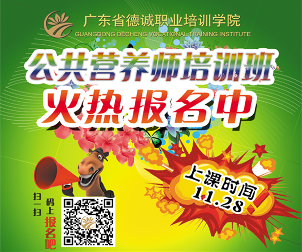 廣東省德誠職業培訓學院計劃11月28日在廣州海珠區沙園本校舉辦新一期營養師培訓班,培訓課程11天,逢周末上課,培訓結束后可參加明年全省統一考試,歡迎有興趣學習營養相關知識或考證的朋友前來報讀,一起聆聽專家們對營養課程的分享,一起用營養致敬生命!