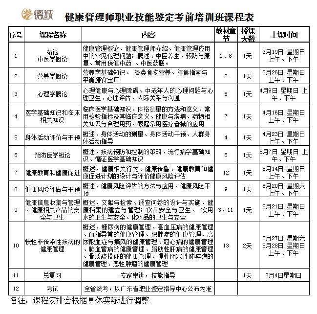 德誠培訓學院將于3月19日舉辦“健康管理師職業資格考前培訓班”。本期培訓班采用面授上課的培訓方式,將邀請各大高等院校知名教授、廣東省健康管理師專家組專家授課。學習期滿參加廣東省人力資源和社會保障廳組織的國家職業資格認證考試,合格后頒發國家職業資格證書(全國通用)。取得職業資格證書的學員,符合條件的(詳見第三項),可以申請3300元/人的政府補貼(粵財社〔2014〕128號文)。現將有關事項通知如下:
