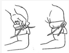 扎結(jié)越早進(jìn)行越好,可用繩子或者把衣服撕成布條,傷口(圈點(diǎn))和結(jié)扎部位如圖。結(jié)扎以動脈血能夠通過,靜脈血不能回流為度。也就是說,結(jié)扎的時候,遠(yuǎn)心端可以摸到動脈的搏動,這種松緊度,和我們平時在醫(yī)院抽血化驗(yàn)時,那種橡膠管綁的松緊度差不多。每半小時到1小時松開結(jié)扎3分鐘。再得到有效治療后即可松開。