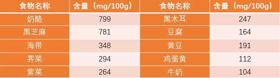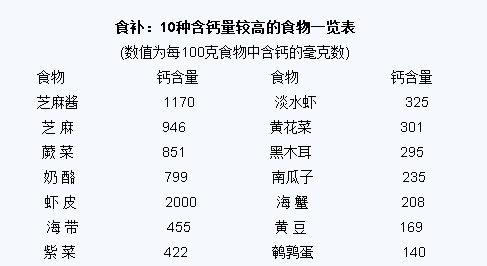 主要有兩種方法,第一是通過食物來補充,哪些食物中含鈣量高呢,大家可以參考下表: