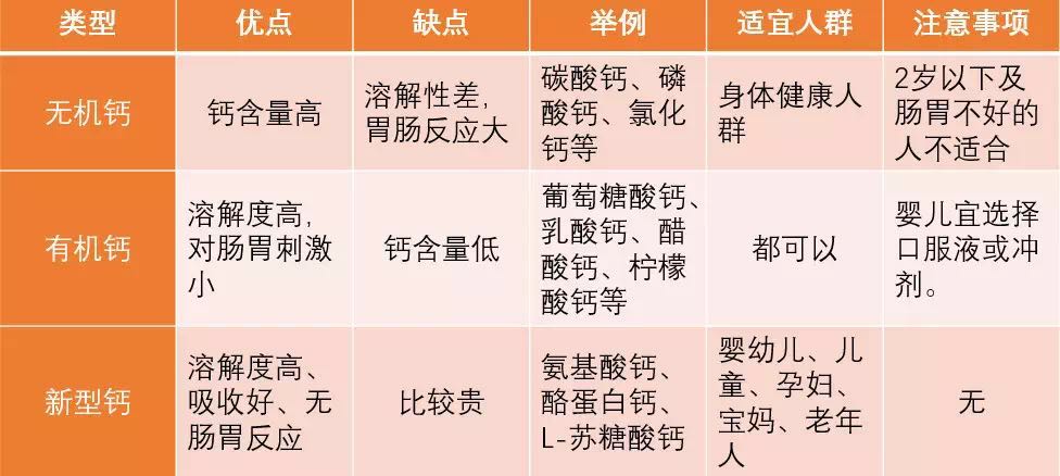 第二,是通過補充鈣劑來迅速補充。下表中列舉了市面上常見的幾種鈣補劑以及對應的優缺點、適應人群,以及不同人群吃的時候的注意事項,大家可以根據自己的實際情況來選擇。