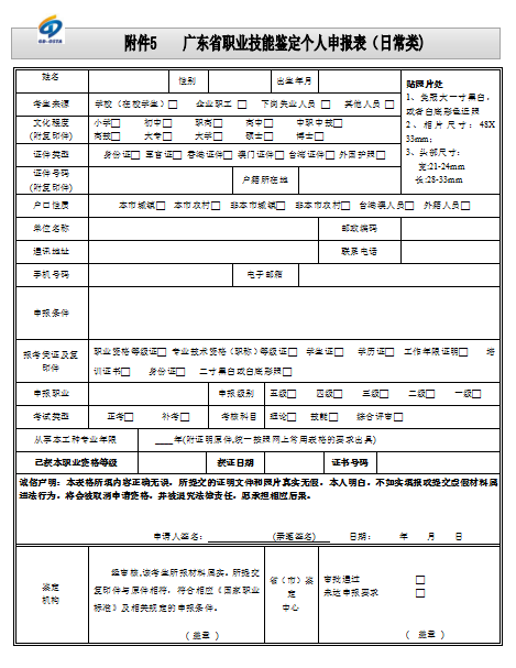 廣東省職業技能鑒定個人申報表(日常類)