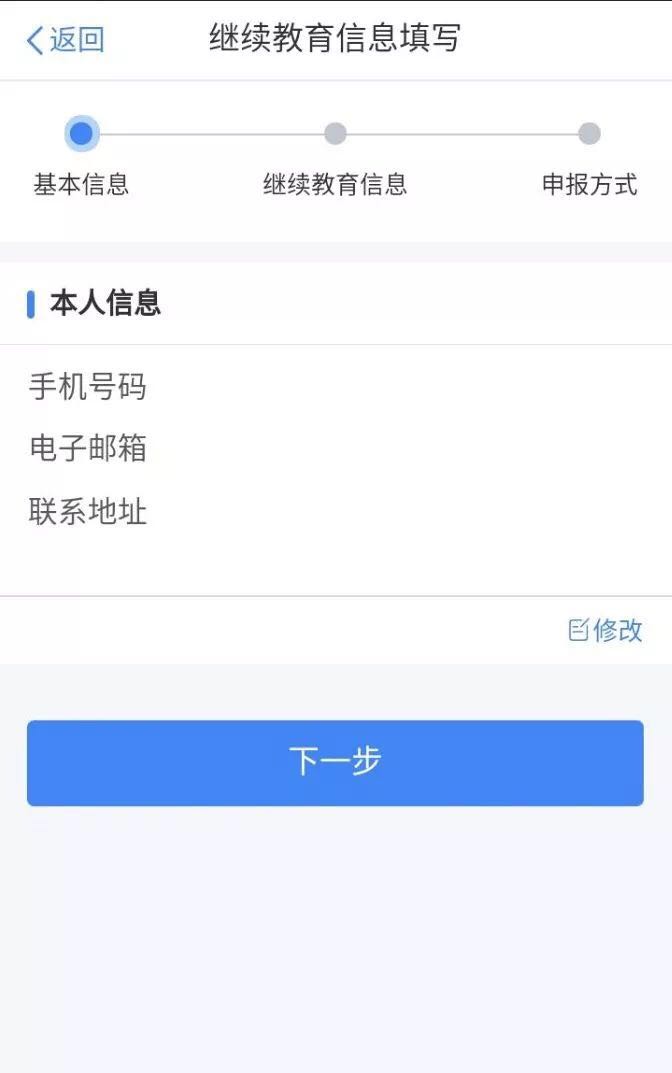 第三步:可以看到個人之前完善的所有信息,你可以在下方點擊"修改"去修改信息,如果沒有要修改的地方,就直接點擊"下一步"。