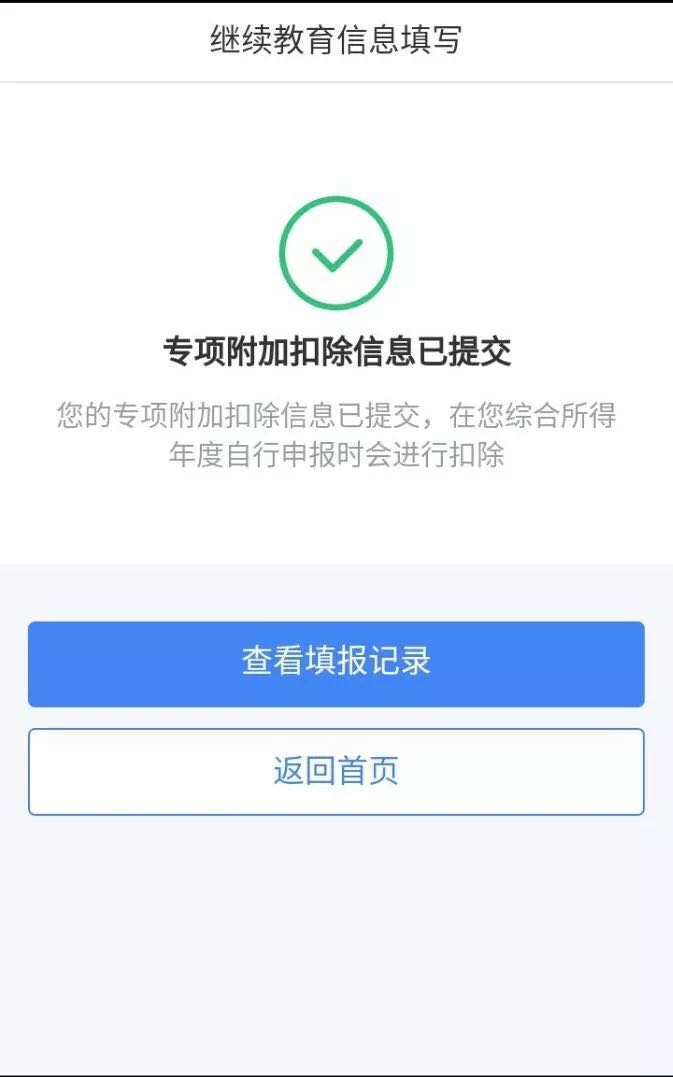第七步,最終確認。在繼續提交完成后,APP會彈出一個反饋頁面,其中提示你:專項附加扣除信息已提交。你可以在后面點擊按鈕"查看填報記錄"去查看自己填寫的內容或者修改,也可以直接點擊"返回首頁"。