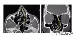 CT顯示扭曲的鼻中隔(黃線)使經鼻氣道不暢,多源于面部撞擊傷。
