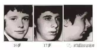 看這個男孩10歲時的照片,嘴唇閉合,面部比例自然協調。14歲時,他的爸爸送給他一只沙鼠作為生日禮物,他就一直養在房間里,同屋的3年里,雖然他對鼠毛過敏,但是他卻寧可口呼吸也不肯送掉這只沙鼠。17歲時的照片,已經長偏了——開唇露齒;嘴唇松弛無力、外翻;下頜骨下降、舌位置下降引起顴骨發育不良、不夠突出;面容拉長;下眼瞼也有些外翻。如果沒有口呼吸,按照基因編碼表達,本該是名美男子呢。