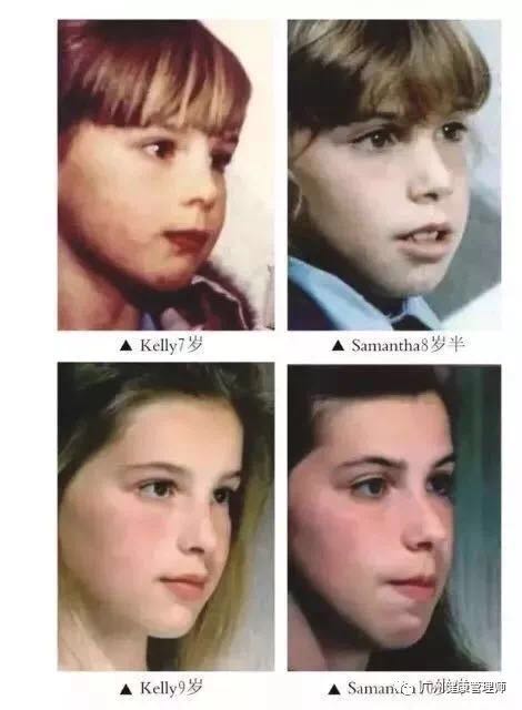再來看一對英國的親姐妹,Kelly7歲和Samantha8歲時因口呼吸問題就診,之后Kelly糾正了口呼吸,9歲時的照片顏面骨骼發育良好,但是Samantha仍用口呼吸,2年后的照片看來,和妹妹相比,上前牙突出;臉頰扁平拉長;下頜后縮??搭佒担緛矶际翘焓箖和模Y果一個長成了天使姐姐,一個卻長成了天使猴猴。