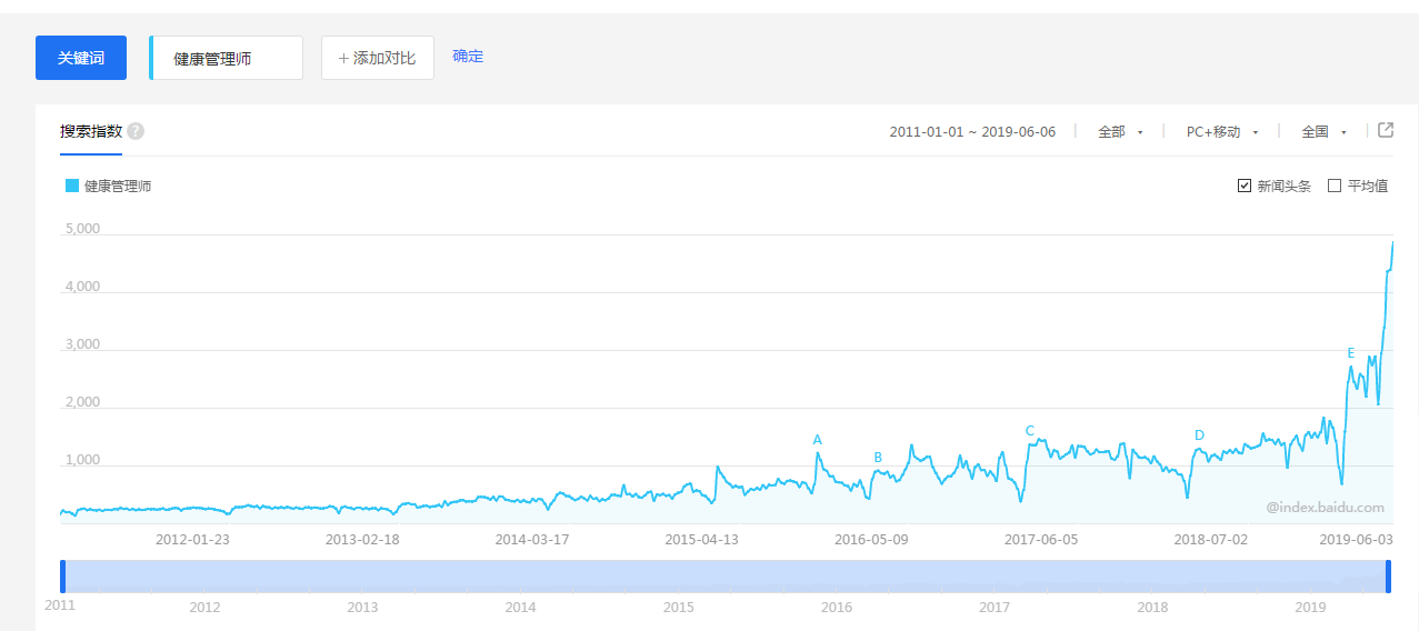 健康管理師百度指數(shù)-全網(wǎng)熱度,逐年上升: