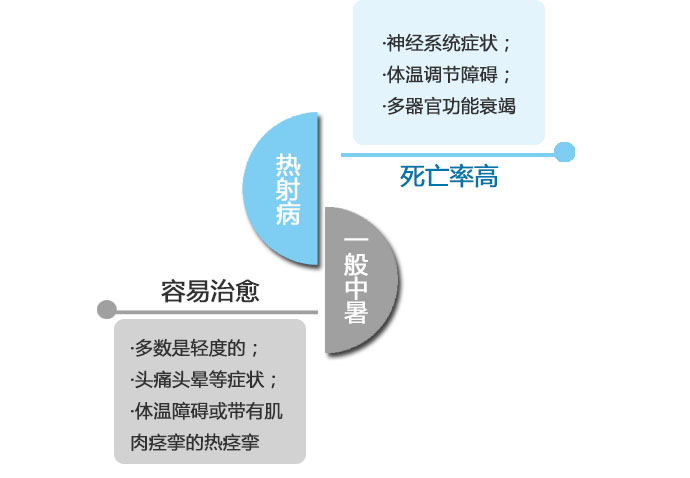 勞力性熱射病:主要是在高溫環境下內源性產熱過多。當周圍環境溫度>27℃,同時相對濕度過高的情況下進行劇烈體力活動即可發病,其主要癥狀有:胸痛、汗毛直立、過度通氣、惡心嘔吐、肌肉痙攣、共濟失調、語無倫次,有些患者意識喪失。可發生溶血、急性腎衰竭、急性肝衰竭等,危及生命。