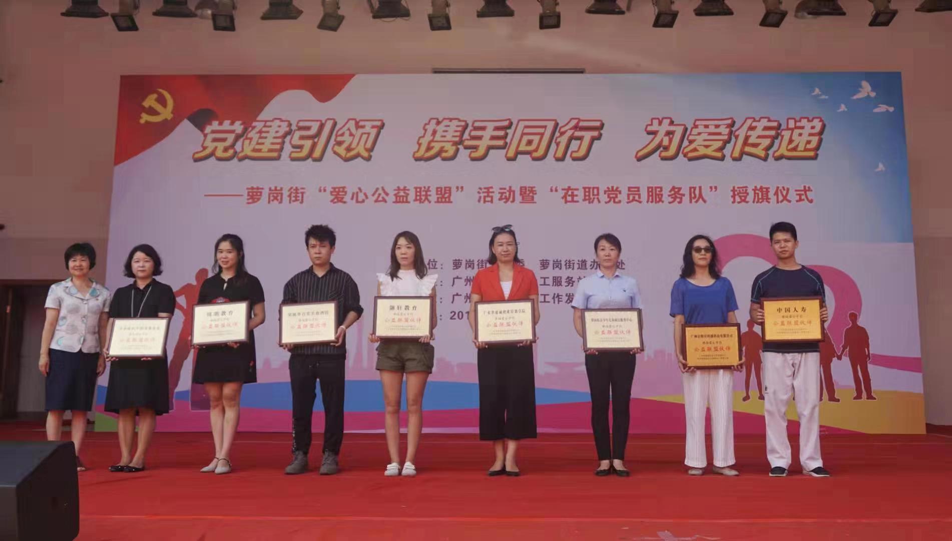 9月3日,在以“黨建引領(lǐng)、攜手同行、為愛(ài)傳遞”為主題的蘿崗街“愛(ài)心公益聯(lián)盟”活動(dòng)暨“在職黨員服務(wù)隊(duì)”授旗儀式的活動(dòng)中,廣州市星空社會(huì)工作發(fā)展中心、廣州市蘿崗街社工服務(wù)站(香雪人家)為廣東省德誠(chéng)職業(yè)培訓(xùn)學(xué)院頒發(fā)“蘿崗愛(ài)心平臺(tái)公益聯(lián)盟伙伴”的牌匾,感謝學(xué)院為社區(qū)居民奉獻(xiàn)愛(ài)心!