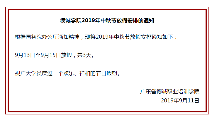 德誠學院2019年中秋節放假安排的通知