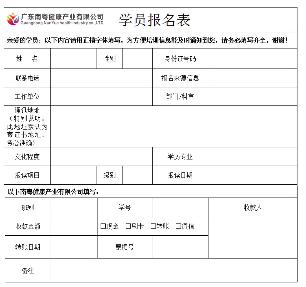 交南粵公司《學(xué)員報(bào)名表》1 份,身份證復(fù)印件1張,白底大一寸彩照2張,并完成繳費(fèi)。