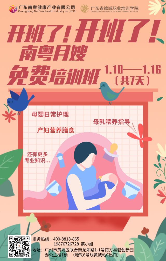 《廣東省實(shí)施“南粵家政”工程促進(jìn)就業(yè)工作方案》中提出,為更好的滿足家庭生活需求,計(jì)劃到2021年培養(yǎng)專業(yè)的母嬰護(hù)理員6萬人次。為促進(jìn)母嬰行業(yè)健康發(fā)展,全面提升母嬰護(hù)理人員的職業(yè)素養(yǎng)和專業(yè)技能,積極發(fā)揮母嬰護(hù)理人員服務(wù)社會的作用。廣東南粵健康產(chǎn)業(yè)有限公司與廣東省德誠職業(yè)培訓(xùn)學(xué)院共同舉辦“第01期母嬰護(hù)理員(月嫂)培訓(xùn)班”(免費(fèi))。培訓(xùn)班聘請高等院校知名教授、婦幼醫(yī)院專家、高級母嬰護(hù)理員(月嫂)等授課,培訓(xùn)后組織參加考核,考核合格者,頒發(fā)廣東南粵健康產(chǎn)業(yè)有限公司和廣東省德誠職業(yè)培訓(xùn)學(xué)院共同簽發(fā)的培訓(xùn)證書。