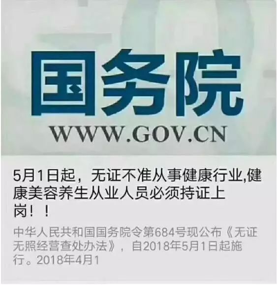 2018年,中華人民共和國國務院令第684號現公布《無證無照經營查處辦法》,自2018年5月1日起,無證不準從事健康行業,健康美容養生從業人員必須持證上崗!!