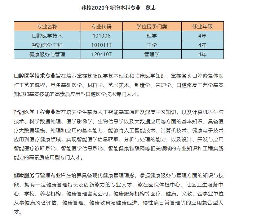 廣東醫(yī)科大學(xué)今年將新增3個(gè)本科專業(yè),分別是口腔醫(yī)學(xué)技術(shù)、智能醫(yī)學(xué)工程、健康服務(wù)與管理。