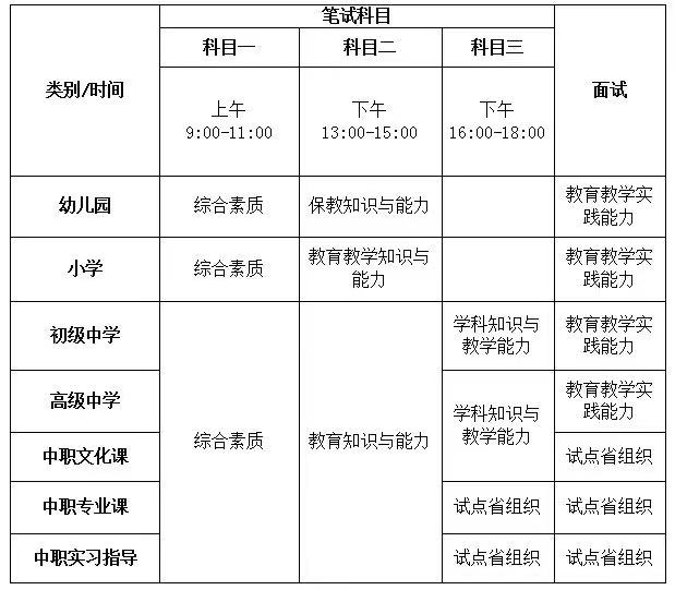1. 幼兒園教師資格面試不分科目。