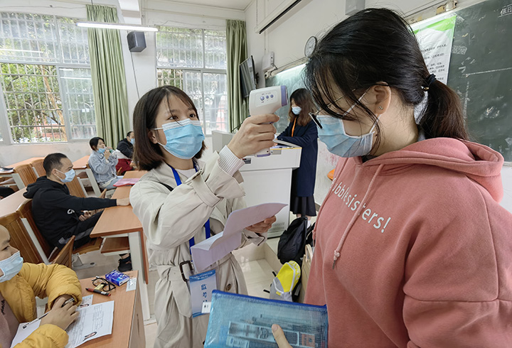 考試當天,負責考務的兩支工作組遵循疫情防控常態化下技能鑒定工作的相關要求,在考生進入考場前,除對考生身份信息進行核對確認,還對參加考試的考生進行體溫測量等防疫檢查。