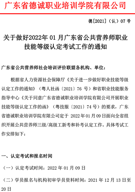 關于做好2022年01月廣東省公共營養師職業技能等級認定考試工作的通知
