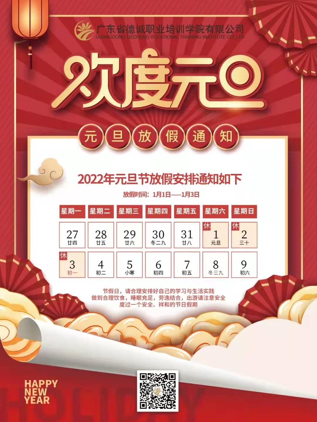 2022年廣東省德誠職業培訓學院有限公司元旦放假通知