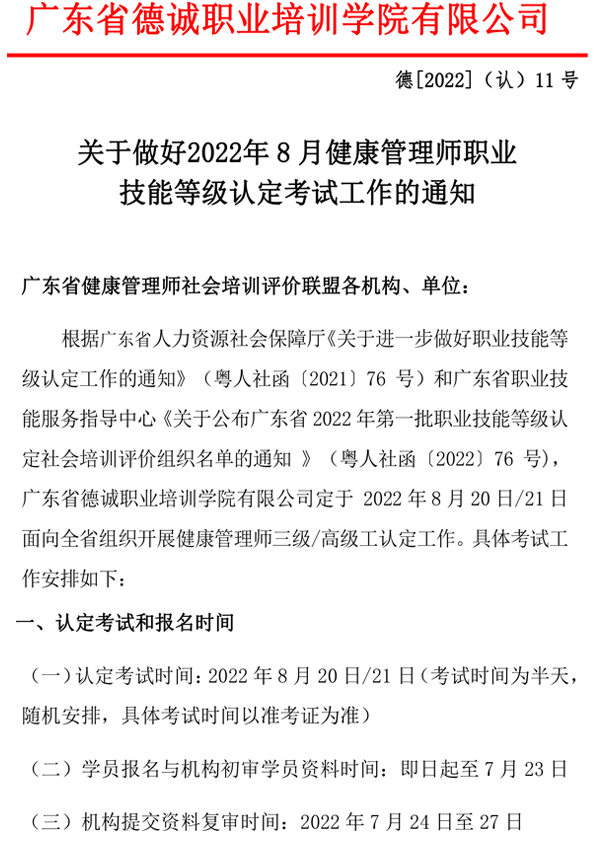 關于做好2022年8月健康管理師職業技能等級認定考試工作的通知內容來源:德誠教育 發布時間:2022-07-14