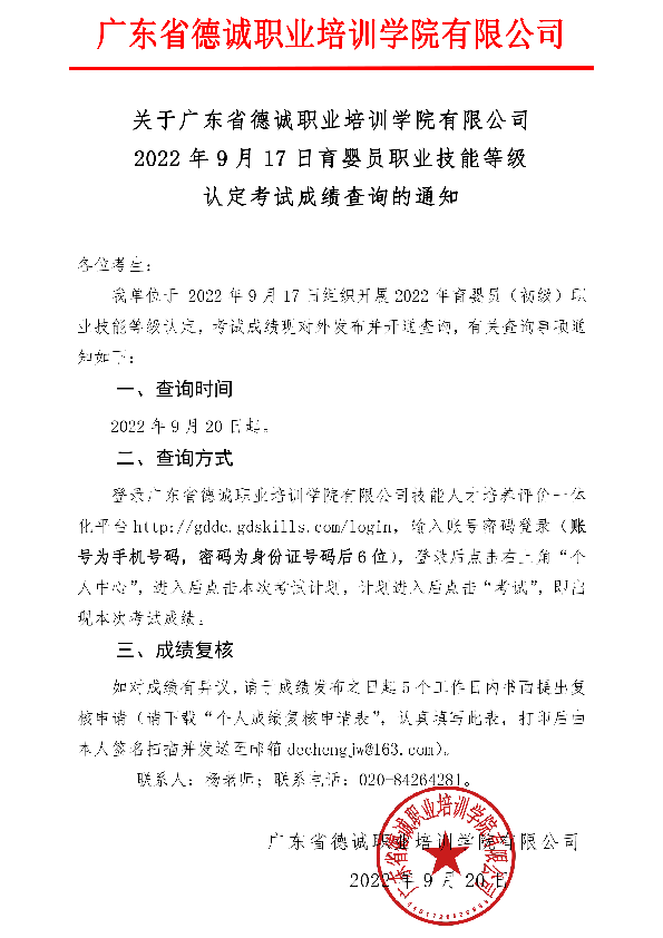 關于廣東省德誠職業培訓學院有限公司2022 年9月17日育嬰員職業技能等級認定考試成績查詢的通知