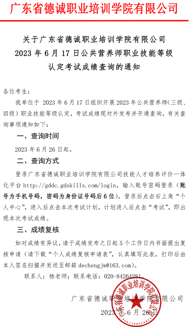 關(guān)于廣東省德誠職業(yè)培訓(xùn)學(xué)院有限公司2023年6月17日公共營養(yǎng)師職業(yè)技能等級認(rèn)定考試成績查詢的通知