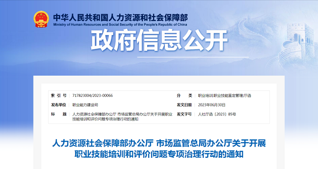 近日,人力資源社會保障部辦公廳、市場監管總局辦公廳印發《關于開展職業技能培訓和評價問題專項治理行動的通知》(人社廳函〔2023〕85號)。