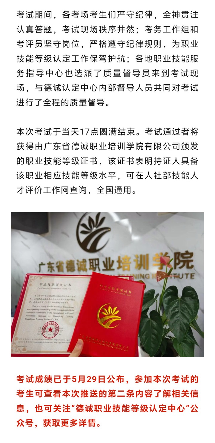關于廣東省德誠職業培訓學院有限公司2024年5月25日健康管理師職業技能等級認定考試成績查詢的通知 (2024-06-01)