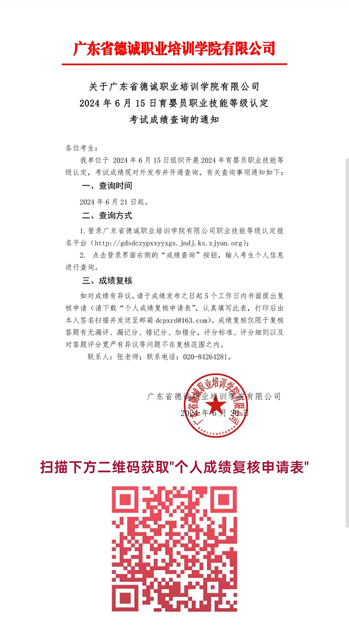 關于廣東省德誠職業培訓學院有限公司2024年6月15日育嬰員職業技能等級認定考試成績查詢的通知