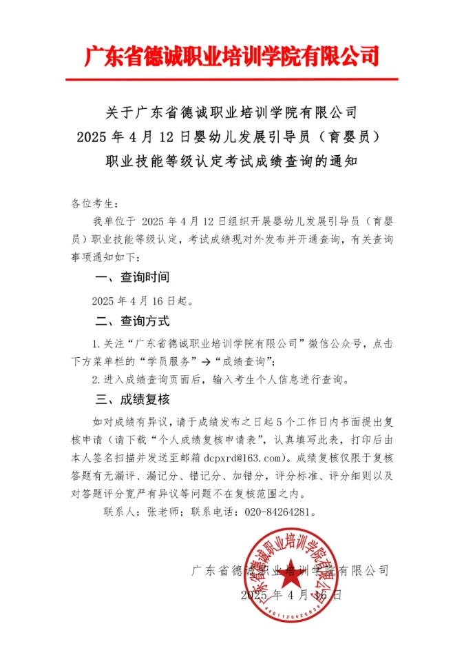 關于廣東省德誠職業培訓學院有限公司2025年4月12日嬰幼兒發展引導員(育嬰員)職業技能等級認定考試成績查詢的通知